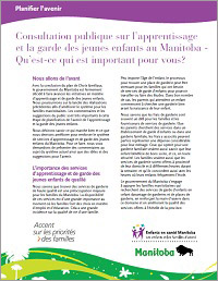 Vos commentaires et suggestions seront très utiles en vue d’aider le gouvernement du Manitoba à répondre aux besoins actuels et futurs des familles et des enfants dans notre province. Nous vous invitons à participer à la consultation provinciale et de nous envoyer vos rétroactions d’ici le 30 novembre 2013 en cliquant sur le lien ci-dessous.