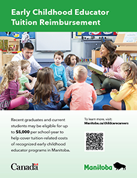 The ECE Tuition Reimbursement will make ECE education more accessible to individuals entering the Early Learning and Child Care (ELCC) workforce and those working to obtain or upgrade their certification. Funding for the Tuition Reimbursement is provided under the Canada-Manitoba Canada-Wide ELCC Agreement.