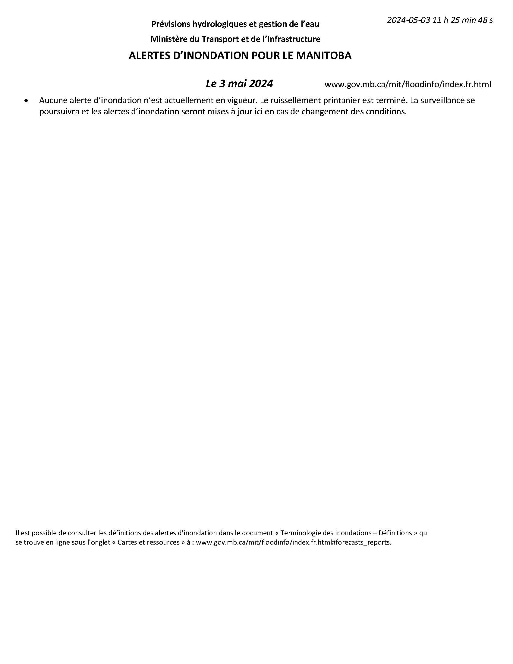Le Centre de prévision des régimes fluviaux fournit des prévisions d’inondations à la fin des mois de février et de mars et à la fin du mois de janvier si le risque d’inondation semble anormalement élevé. Lors d’une inondation, les prévisions indiquent chaque jour les niveaux et les débits des rivières, au fur et à mesure que le ruissellement continue. Le Centre fournit également des prévisions quotidiennes des débits et des niveaux d’eau à des endroits clés pendant la saison des eaux libres au besoin. Ces prévisions sont publiées sous la forme de feuilles de renseignements sur les inondations, de rapports quotidiens sur les inondations et de bulletins sur les inondations. En outre, le Centre élabore un rapport sur les conditions automnales, qui résume l’humidité du sol, les débits de base et les niveaux d’eau avant le gel. Pour en savoir plus sur la terminologie des inondations, consultez la section «Cartes et ressources».
