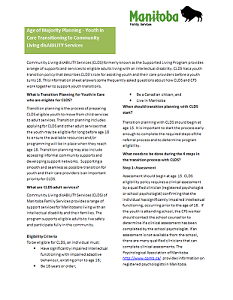 Community Living disABILITY Services (CLDS) formerly known as the Supported Living Program provides a range of supports and services to eligible adults living with an intellectual disability. CLDS has a youth transition policy that describes CLDS’s role for assisting youth and their care providers before a youth turns 18. This information sheet answers some frequently asked questions about how CLDS and CFS work together to support youth transitions.
