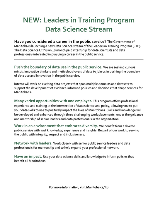 - Data Science Stream - a two-year data science stream includes three unique work rotations with opportunities to work on exciting data projects that span multiple domains and datasets to support the development of evidence-informed policies and decisions that shape services for Manitobans. (recruiting in 2025)