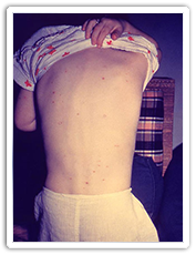 One to two days after the initial symptoms, an itchy rash may appear. This soon turns into blisters filled with fluid. Children who are infected can become covered with many blisters. These appear mainly on their face, scalp and chest. Blisters that become infected can result in permanent scarring . After approximately five days, the blisters dry out and become crusted. These symptoms usually last 7 to 10 days after the initial symptoms start.