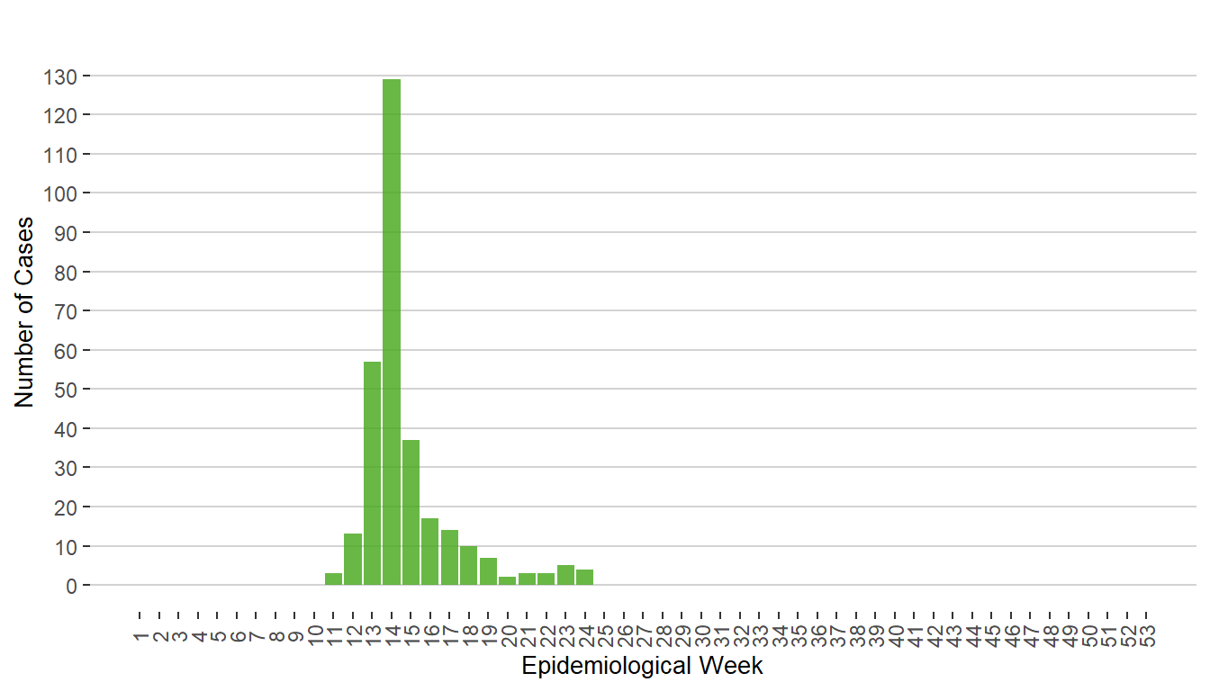 Figure 1. Cases of COVID-19 by Week of Public Health Report Date, Manitoba, 2020