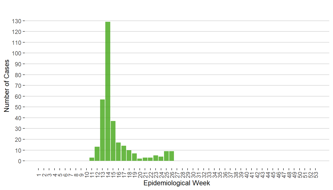 Figure 1. Cases of COVID-19 by Week of Public Health Report Date, Manitoba, 2020