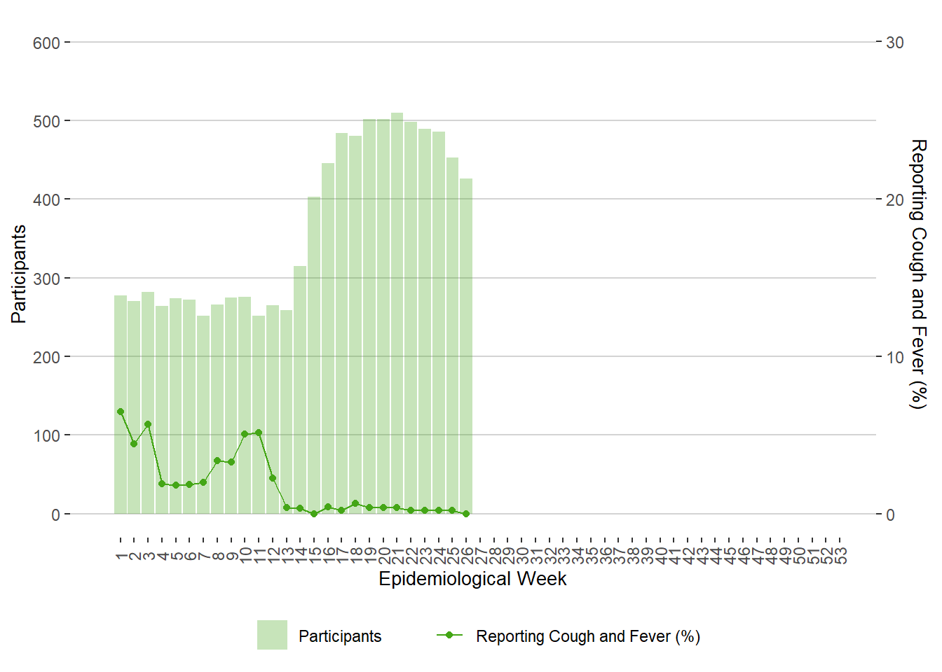 Figure 7. Weekly FluWatchers Participants and Percentage Reporting Fever and Cough, Manitoba, 2020