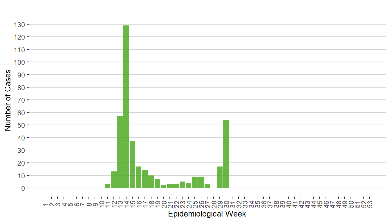Figure 1. Cases of COVID-19 by Week of Public Health Report Date, Manitoba, 2020