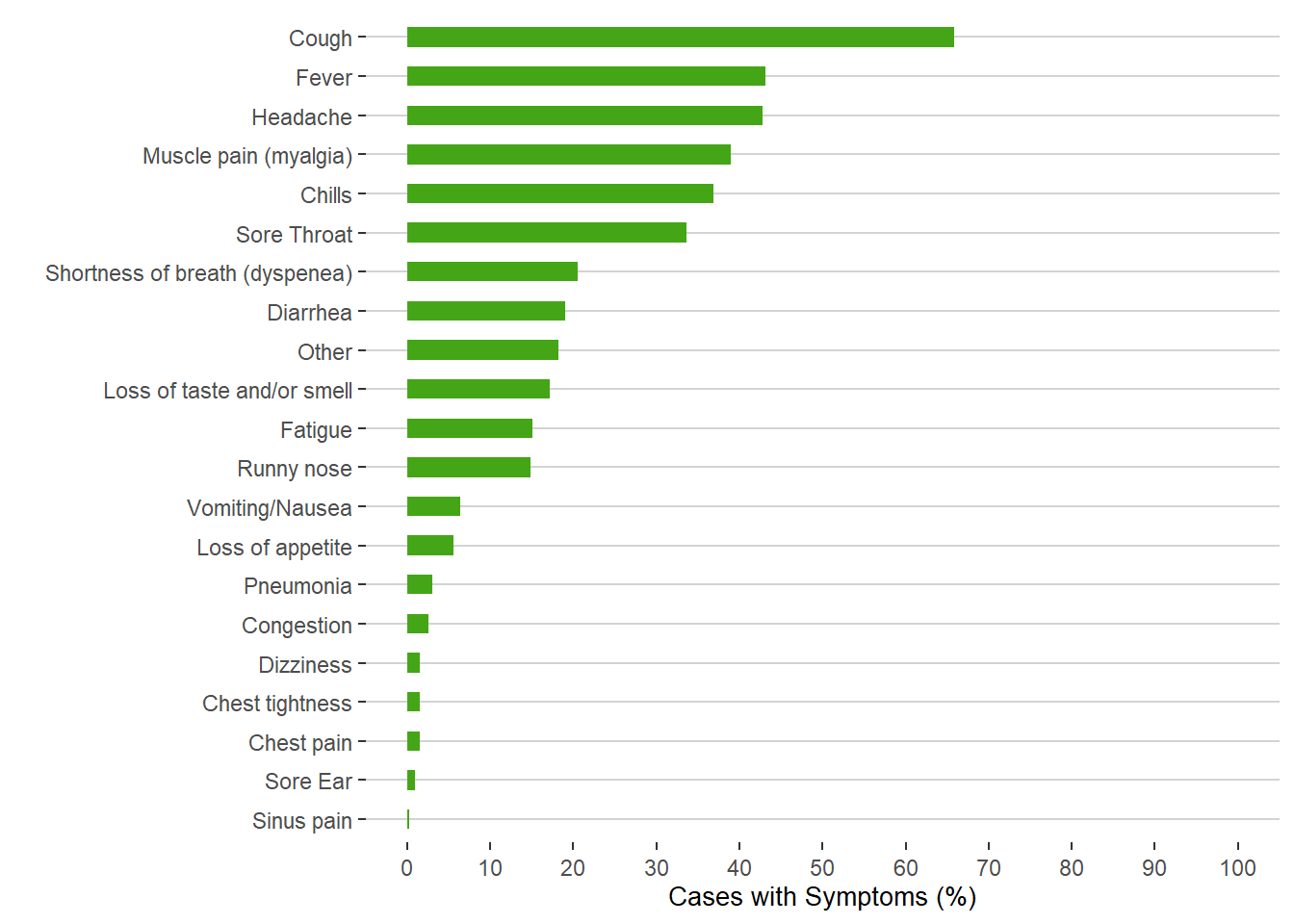 Figure 11. Percentage of Symptoms Reported by COVID-19 Cases, Manitoba, 2020
