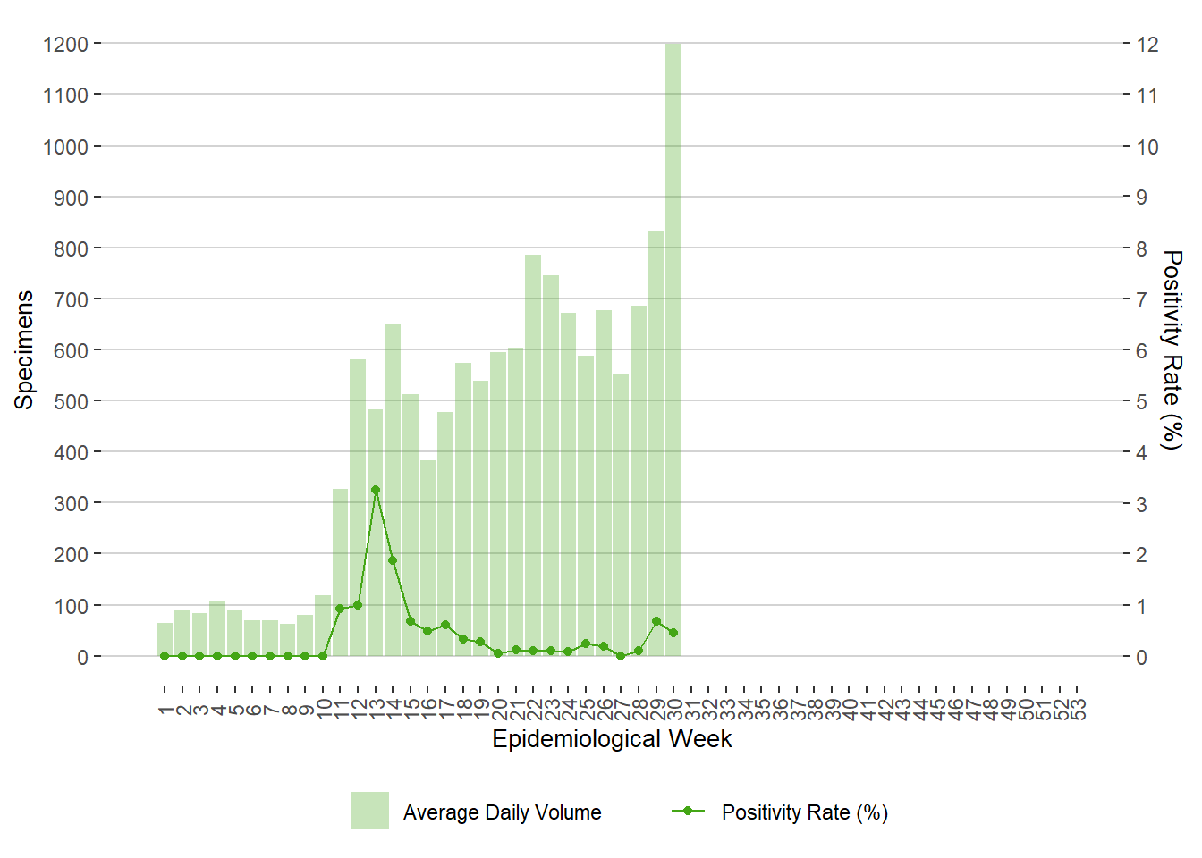 Figure 3. Average Daily Testing Volume and Positivity (%) for COVID-19 by Week of Specimen Receiving Date, Manitoba, 2020