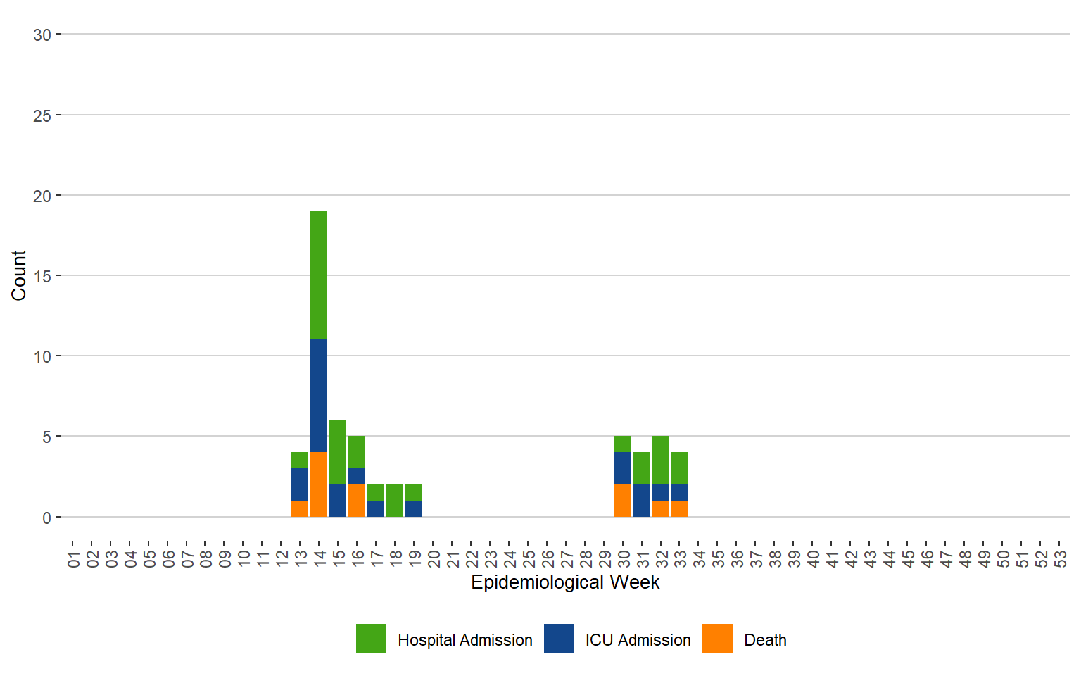 Figure 4. Severe Outcomes of COVID-19 by Week of Public Health Report Date, Manitoba, 2020
