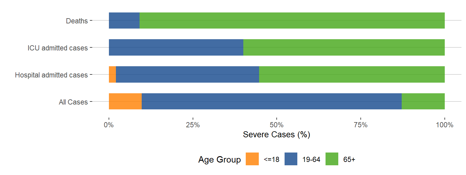 Figure 5. Age Distribution of Severe COVID-19 Cases Compared to All Cases, Manitoba, 2020