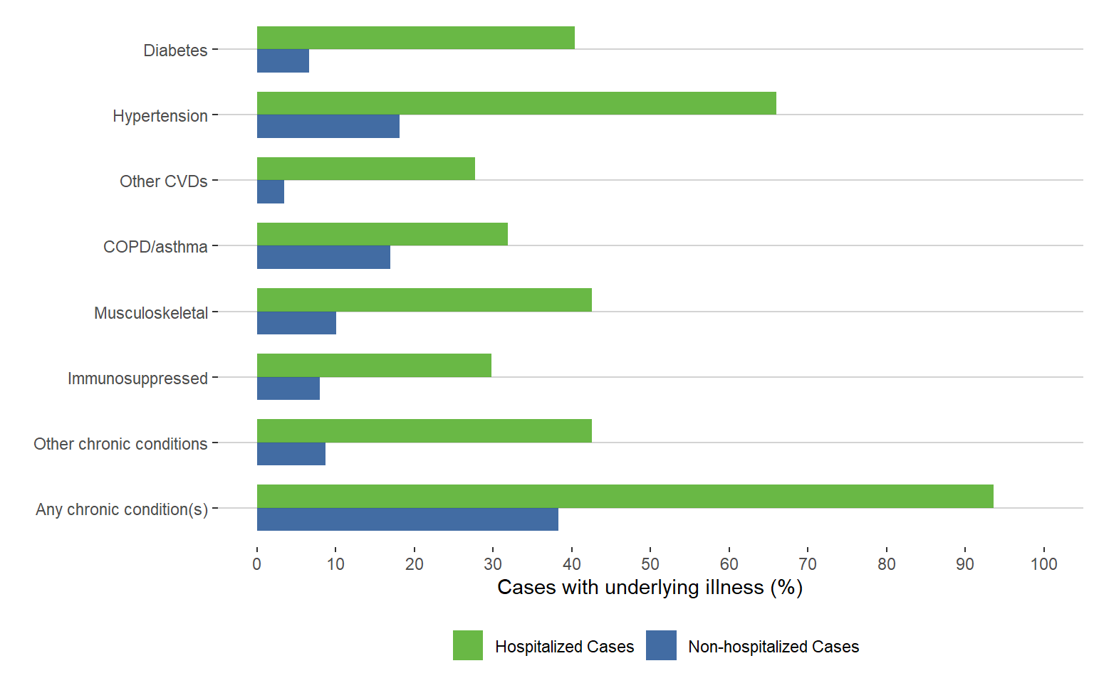 Note. Musculoskeletal illnesses include osteoporosis, osteoarthritis, rheumatoid arthritis, gout and crystal arthropathies; Immunosuppressed illnesses include organ transplants, immune deficiency; COPD-chronic obstructive pulmonary disease; CVD-cardiovascular disease; Other chronic conditions include cancer, chronic liver disease, obesity, chronic kidney disease. About definitions of chronic conditions
