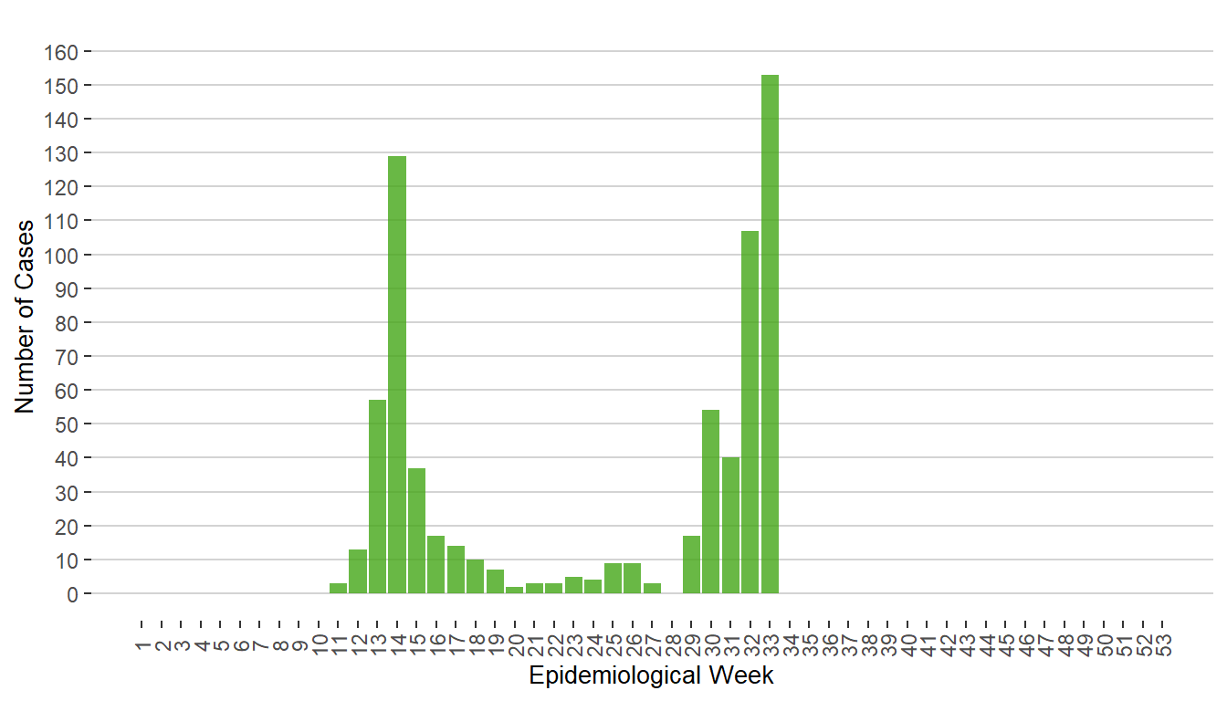 Figure 1. Cases of COVID-19 by Week of Public Health Report Date, Manitoba, 2020