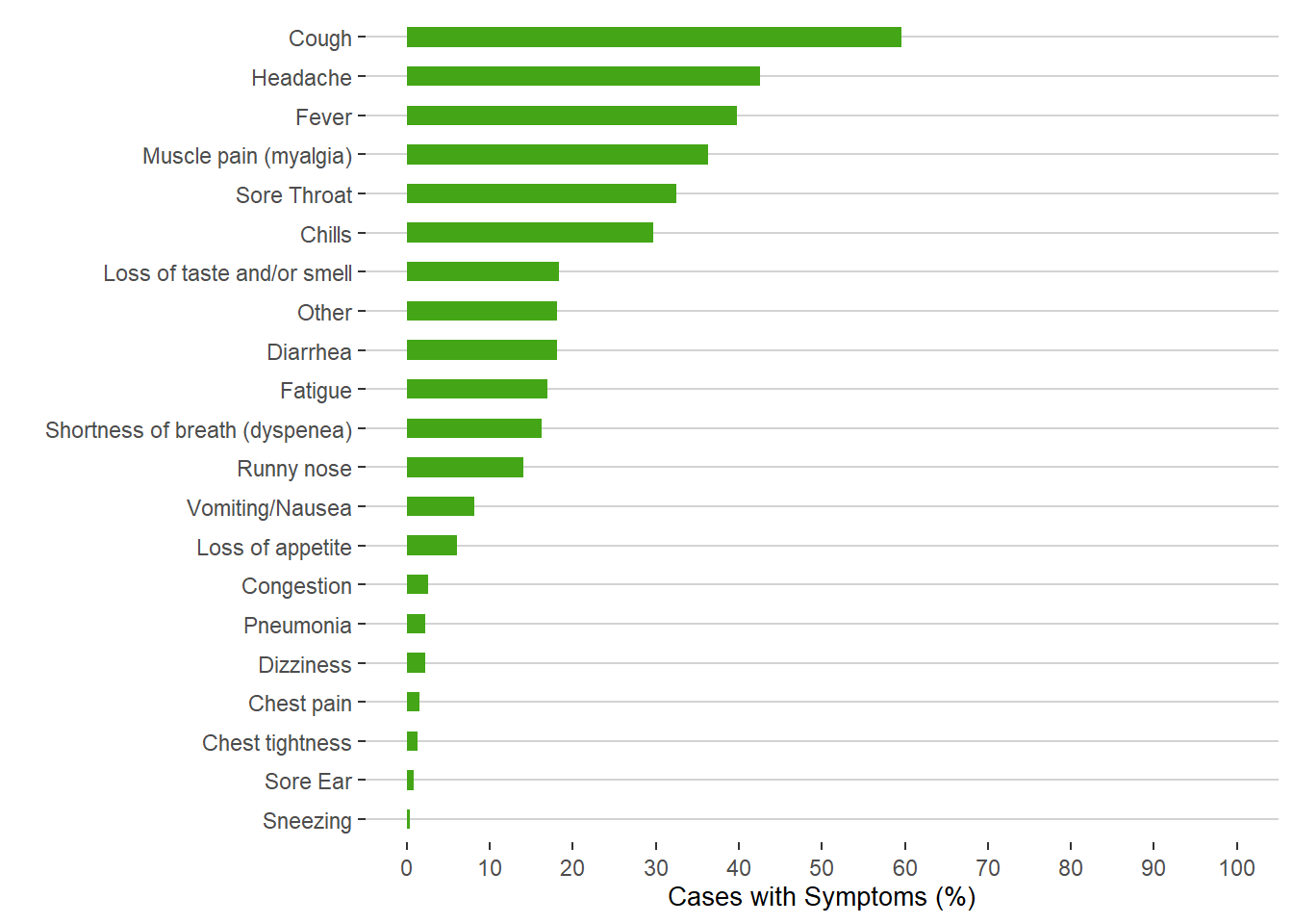 Figure 11. Percentage of Symptoms Reported by COVID-19 Cases, Manitoba, 2020
