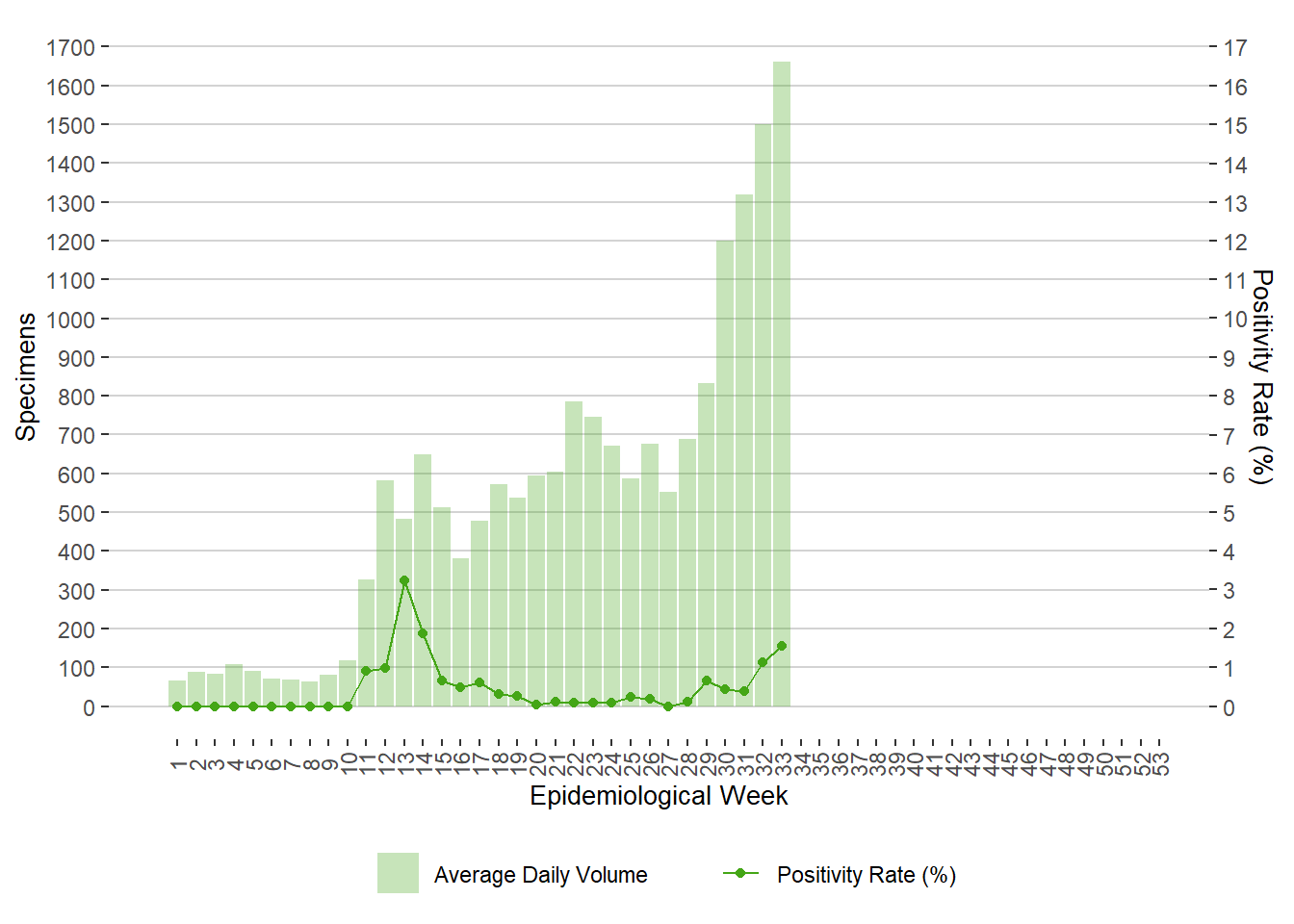 Figure 3. Average Daily Testing Volume and Positivity (%) for COVID-19 by Week of Specimen Receiving Date, Manitoba, 2020