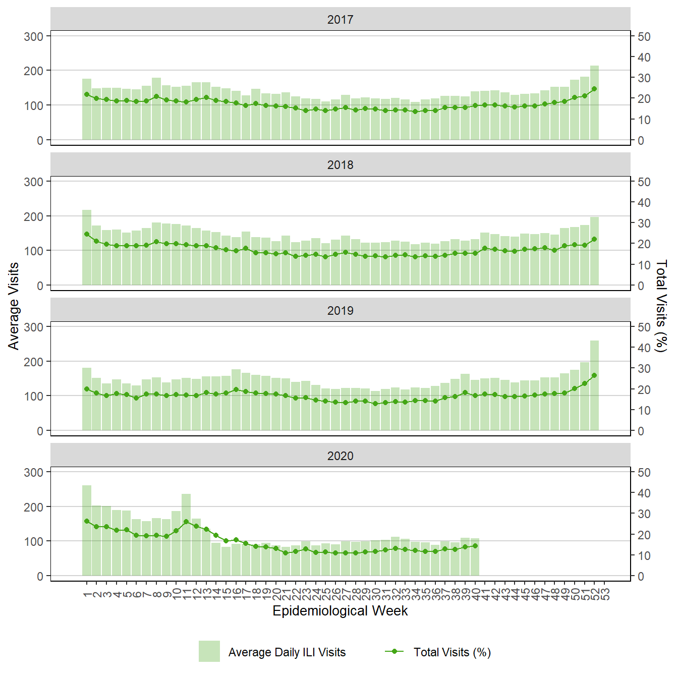 Figure 11. Weekly Respiratory Visits to Emergency Department, Winnipeg Regional Health Authority, Manitoba, 2017 – 2020