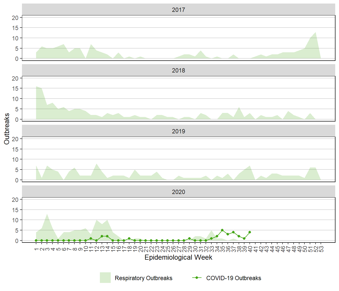 Figure 8. Weekly Respiratory and COVID-19 Outbreaks, Manitoba, 2017 – 2020