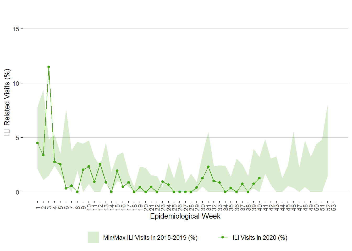 Figure 10. Weekly Percentage of ILI Related Visits to Sentinel Physicians, Manitoba, 2017 – 2020