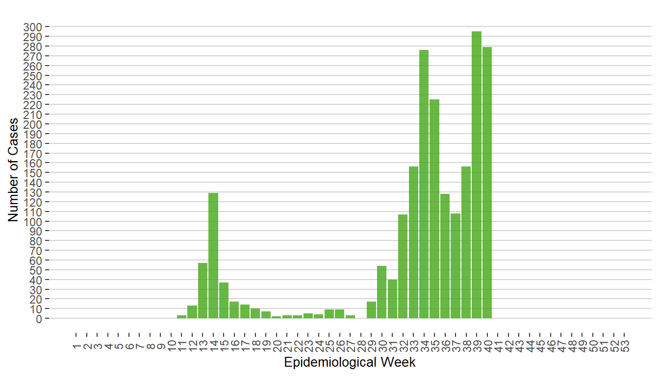 Figure 1. Cases of COVID-19 by Week of Public Health Report Date, Manitoba, 2020