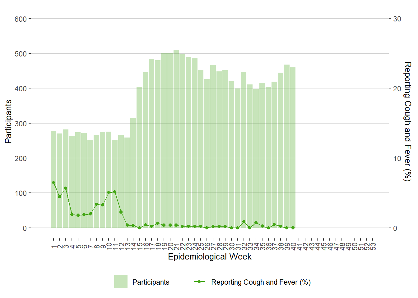 Figure 9. Weekly FluWatchers Participants and Percentage Reporting Fever and Cough, Manitoba, 2020