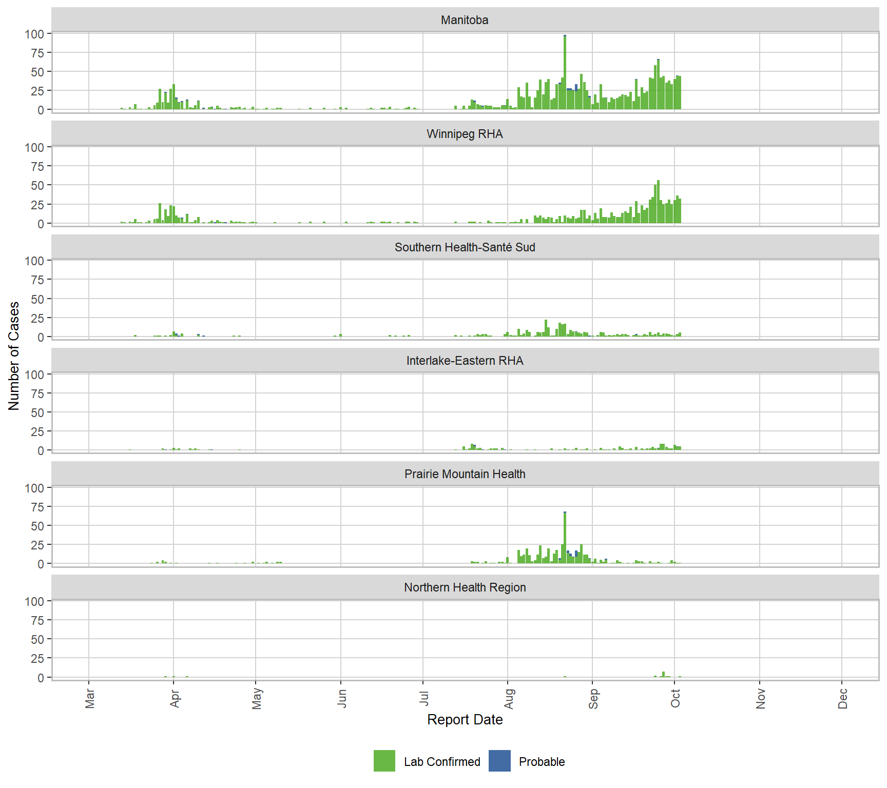 Figure 3. Cases of COVID-19 by Health Region and Public Health Report Date, Manitoba, 2020