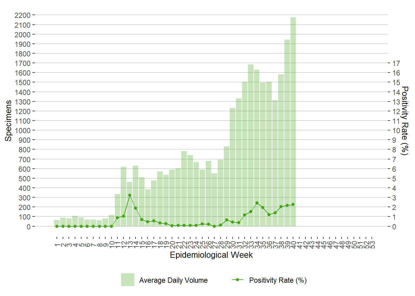 Figure 4. Average Daily Testing Volume and Positivity (%) for COVID-19 by Week of Specimen Receiving Date, Manitoba, 2020