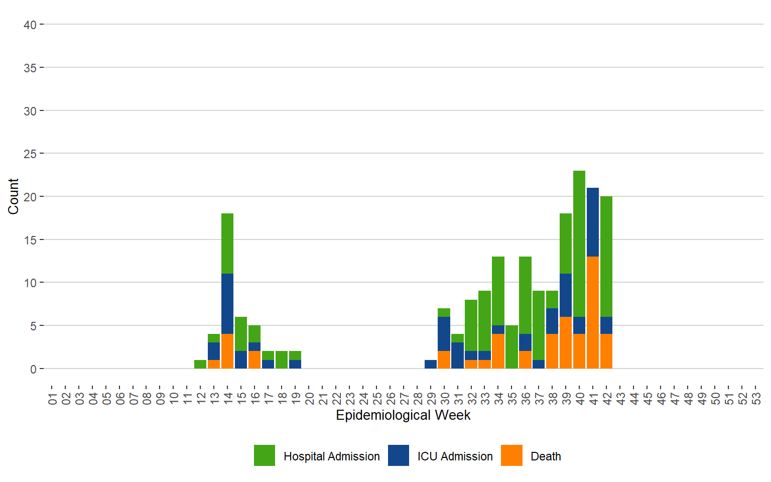 Figure 5. Severe Outcomes of COVID-19 by Week of Public Health Report Date, Manitoba, 2020