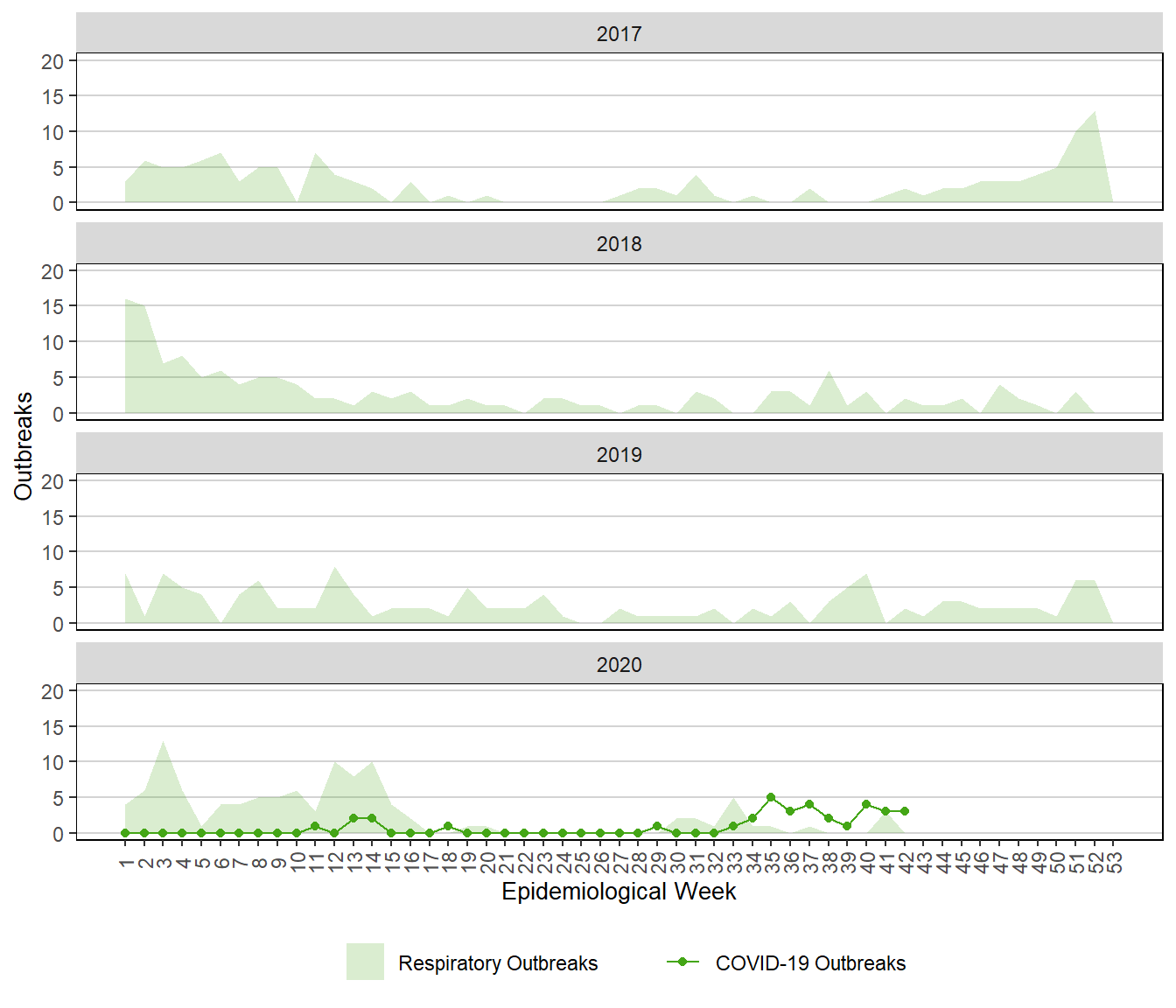 Figure 8. Weekly Respiratory and COVID-19 Outbreaks, Manitoba, 2017 – 2020