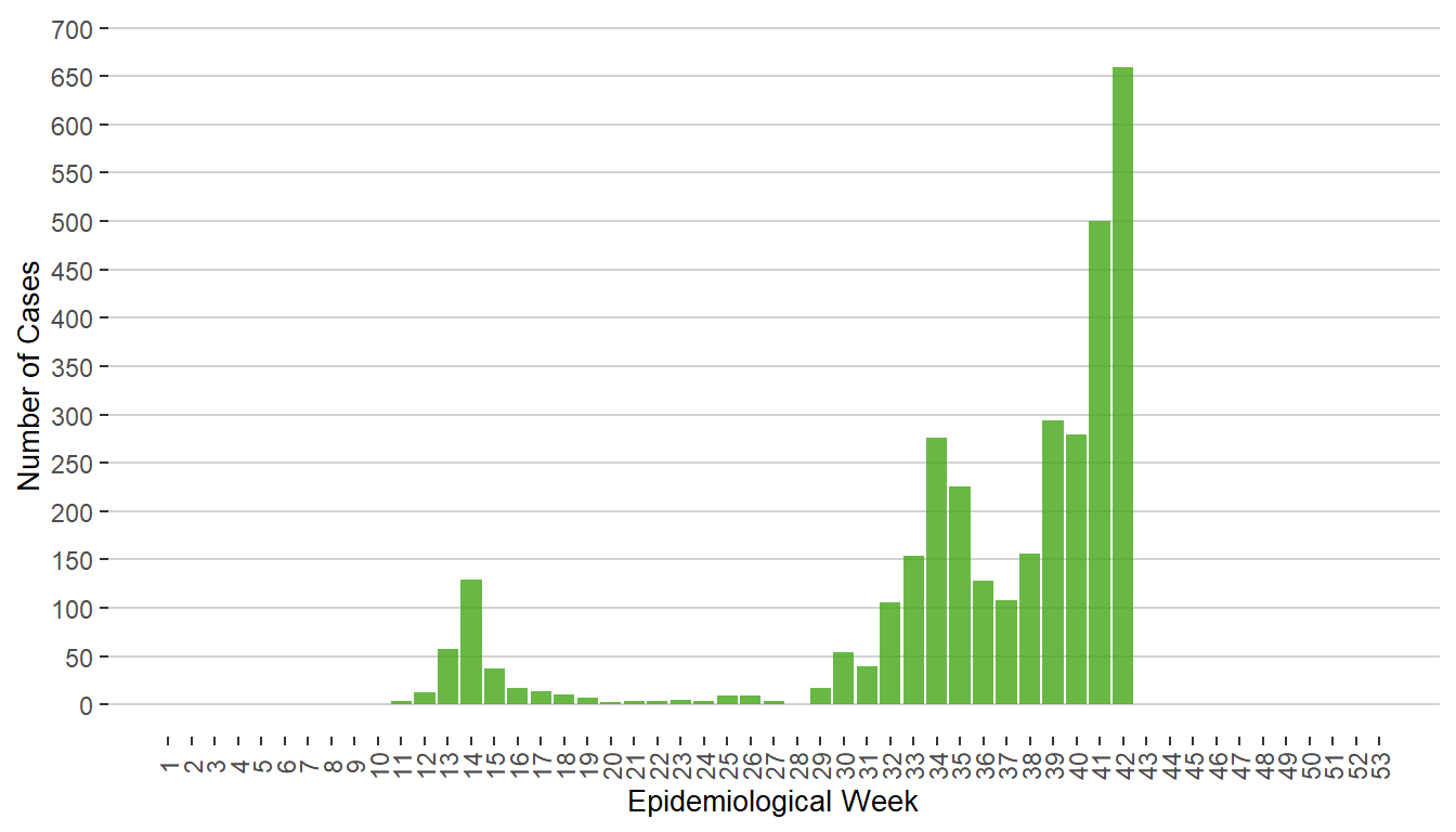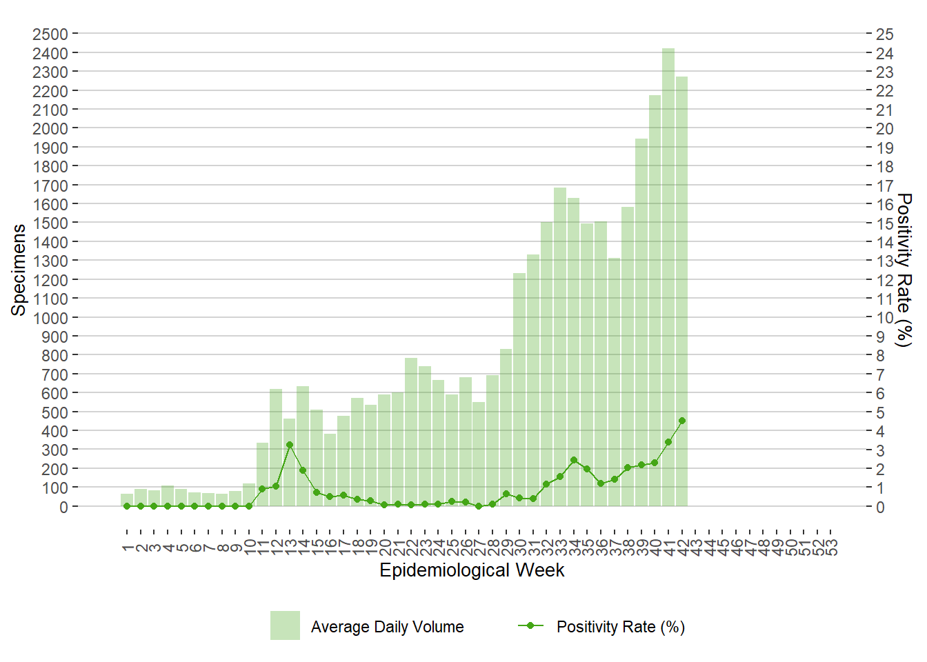 In Week 42, there were 659 laboratory-confirmed COVID-19 cases reported in Manitoba, an increase from 502 in the previous week. The volume of lab tests decreased to on average 2,273 people tested for COVID-19 per day compared to 2,419 in the previous week. The positivity rate of lab tests was 4.5%, an increase from 3.4% in the previous week. The respiratory activity levels in the community, primary care and emergency rooms continued to be low.