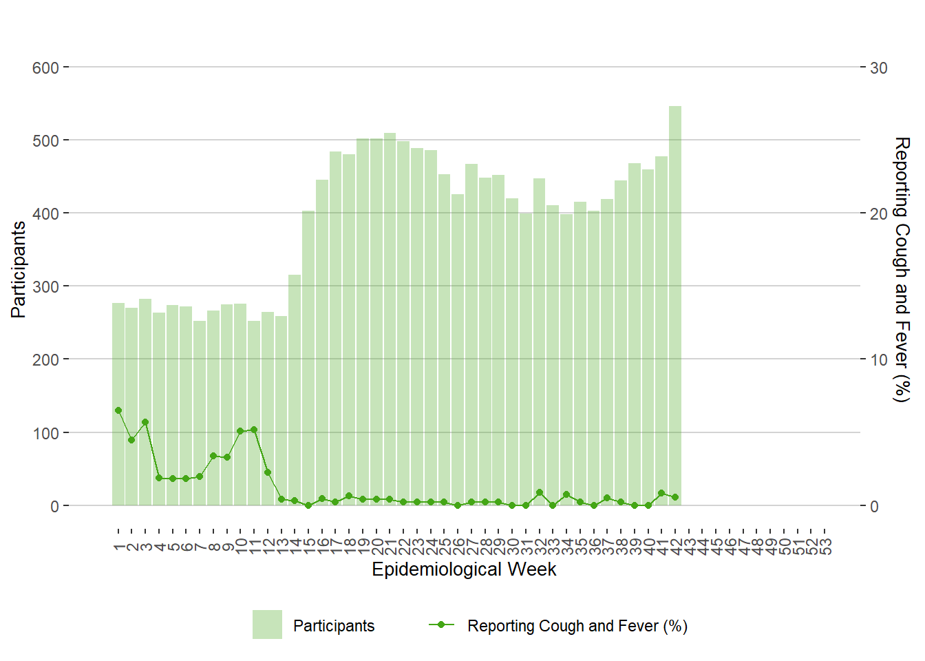 Figure 9. Weekly FluWatchers Participants and Percentage Reporting Fever and Cough, Manitoba, 2020
