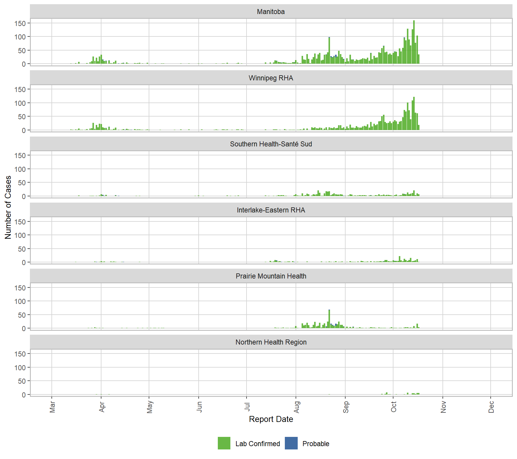 Figure 3. Cases of COVID-19 by Health Region and Public Health Report Date, Manitoba, 2020