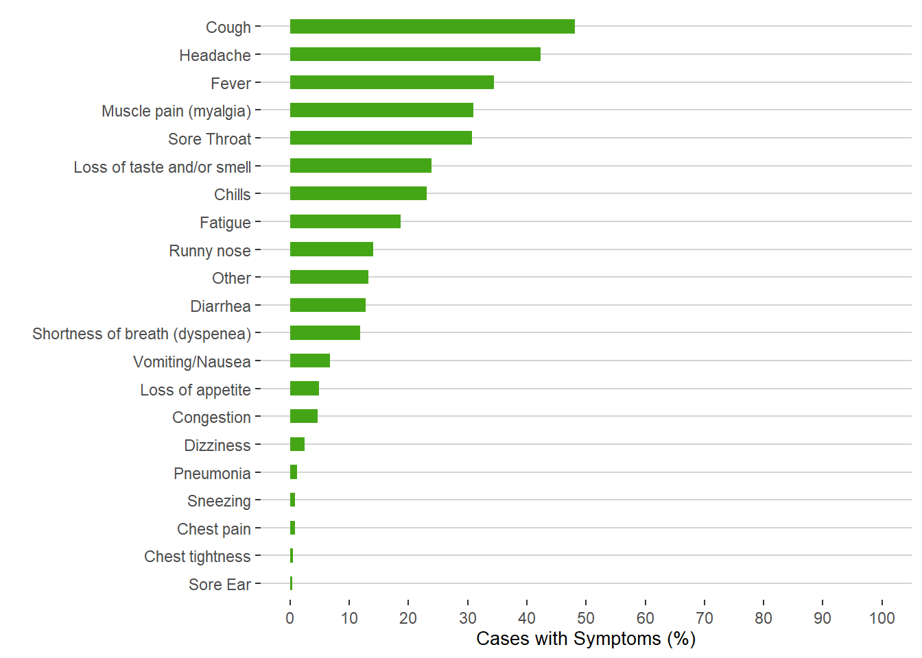 Figure 12. Percentage of Symptoms Reported by COVID-19 Cases, Manitoba, 2020