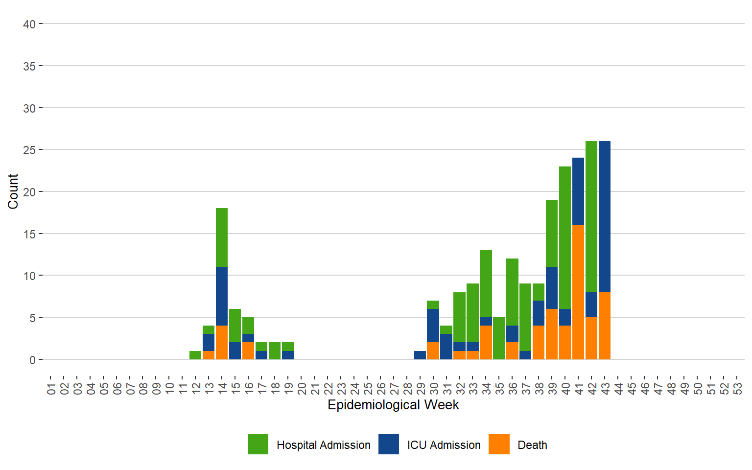 Figure 5. Severe Outcomes of COVID-19 by Week of Public Health Report Date, Manitoba, 2020