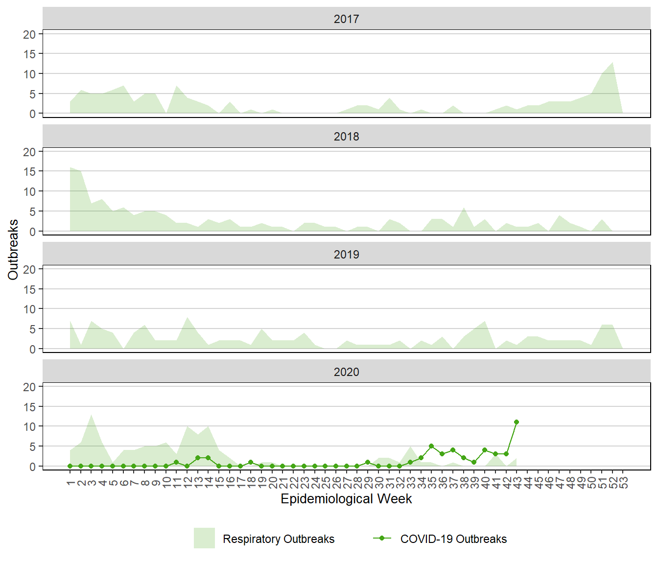 Figure 8. Weekly Respiratory and COVID-19 Outbreaks, Manitoba, 2017 – 2020