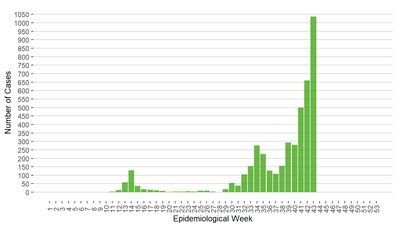 Figure 1. Cases of COVID-19 by Week of Public Health Report Date, Manitoba, 2020