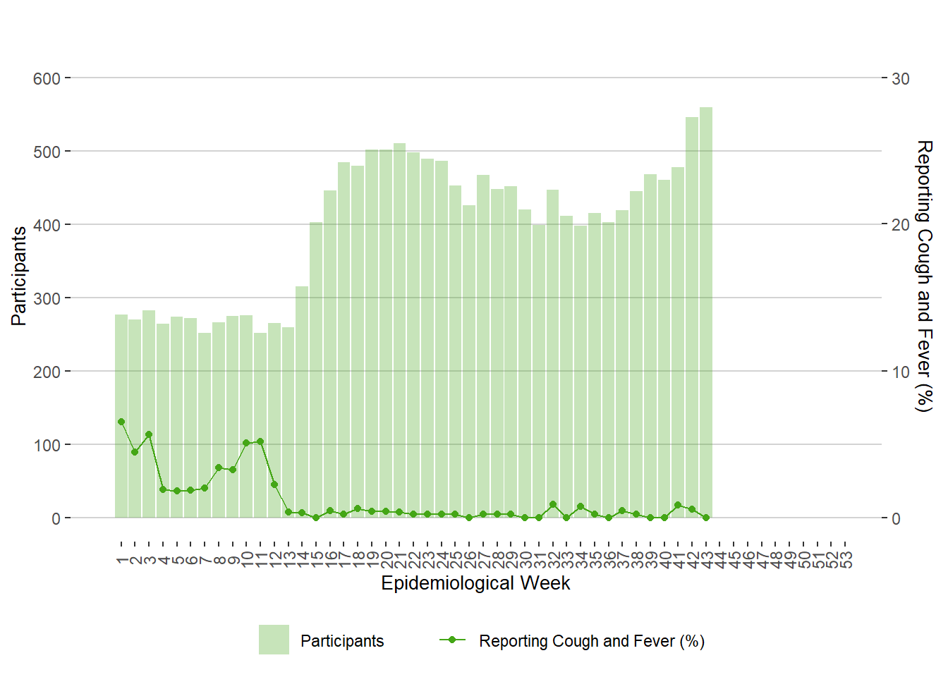 Figure 9. Weekly FluWatchers Participants and Percentage Reporting Fever and Cough, Manitoba, 2020