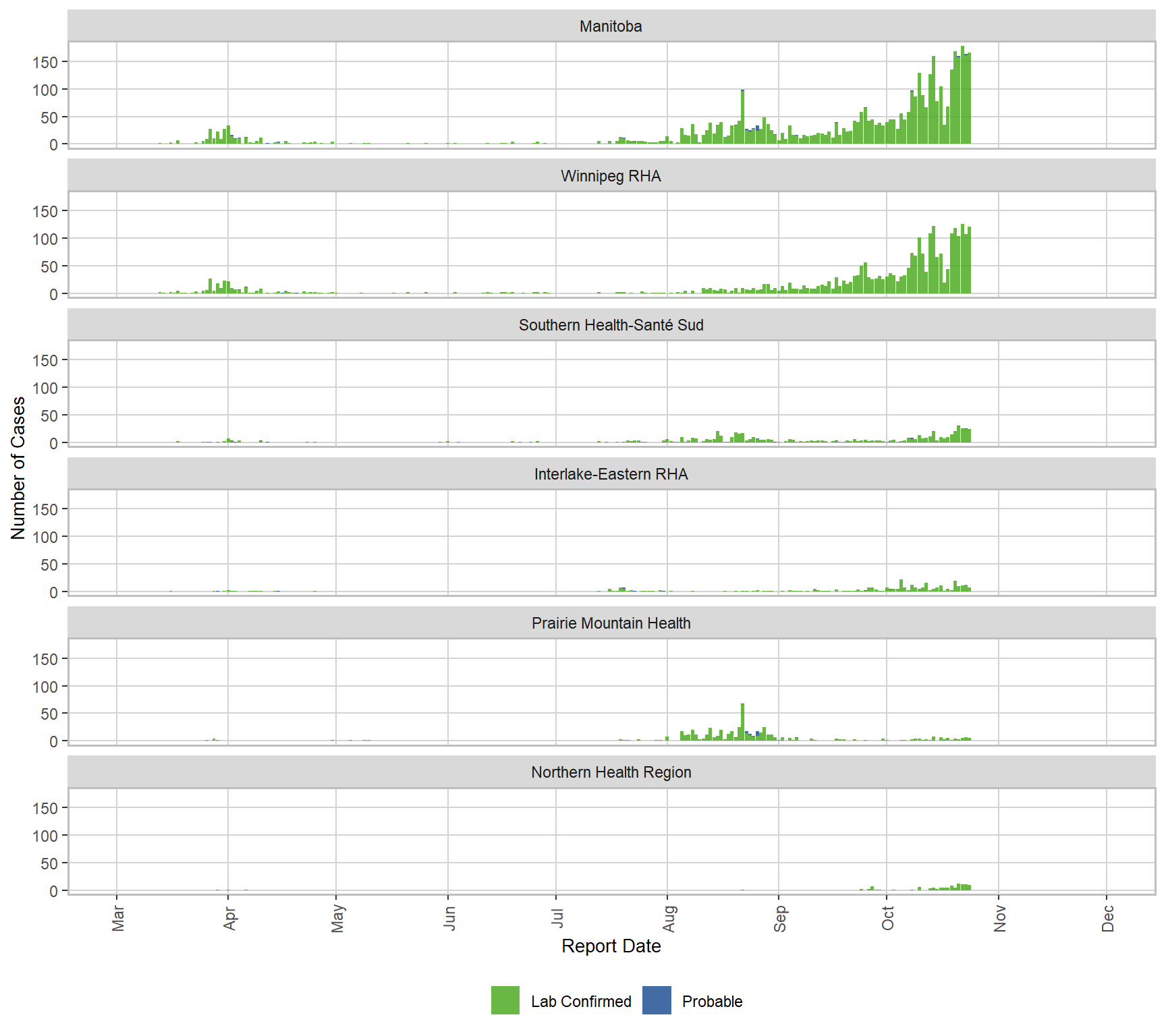 Figure 3. Cases of COVID-19 by Health Region and Public Health Report Date, Manitoba, 2020