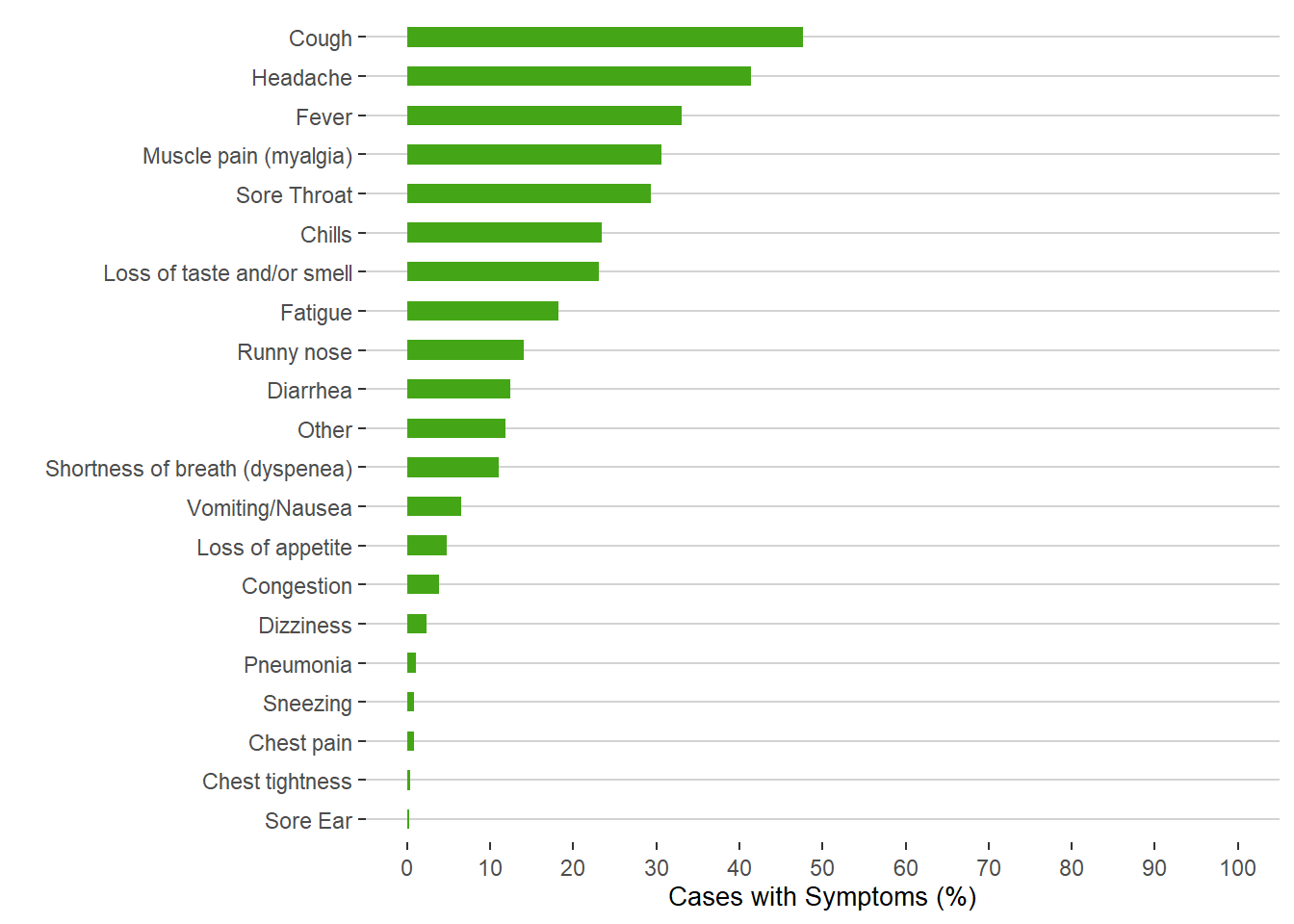 Figure 12. Percentage of Symptoms Reported by COVID-19 Cases, Manitoba, 2020