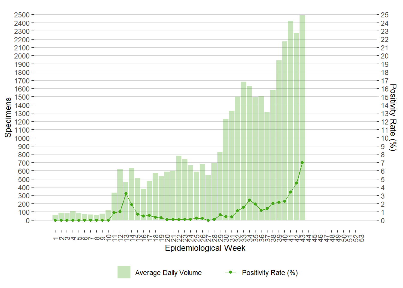 Figure 4. Average Daily Testing Volume and Positivity (%) for COVID-19 by Week of Specimen Receiving Date, Manitoba, 2020