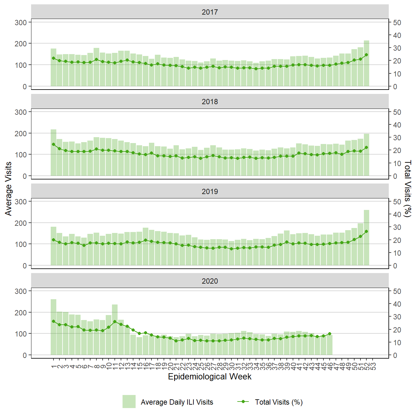 Figure 10. Weekly Percentage of ILI Related Visits to Sentinel Physicians, Manitoba, 2017 – 2020