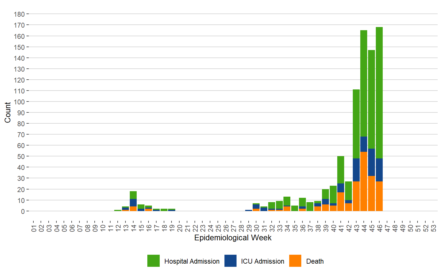 Figure 5. Severe Outcomes of COVID-19 by Week of Public Health Report Date, Manitoba, 2020
