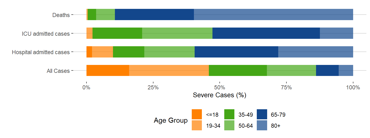 Figure 6. Age Distribution of Severe COVID-19 Cases Compared to All Cases, Manitoba, 2020