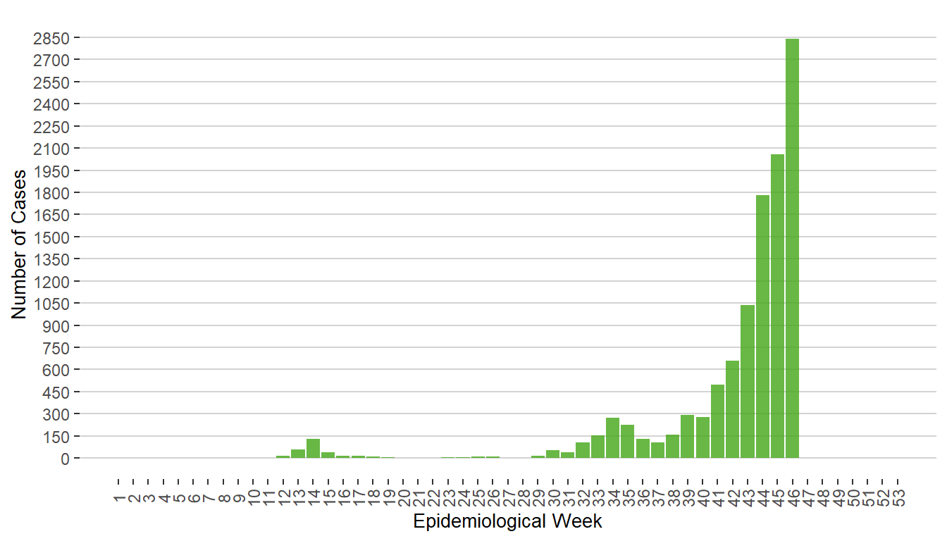Figure 1. Cases of COVID-19 by Week of Public Health Report Date, Manitoba, 2020