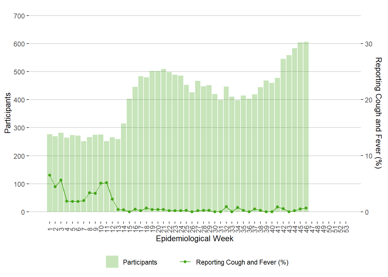 Figure 9. Weekly FluWatchers Participants and Percentage Reporting Fever and Cough, Manitoba, 2020
