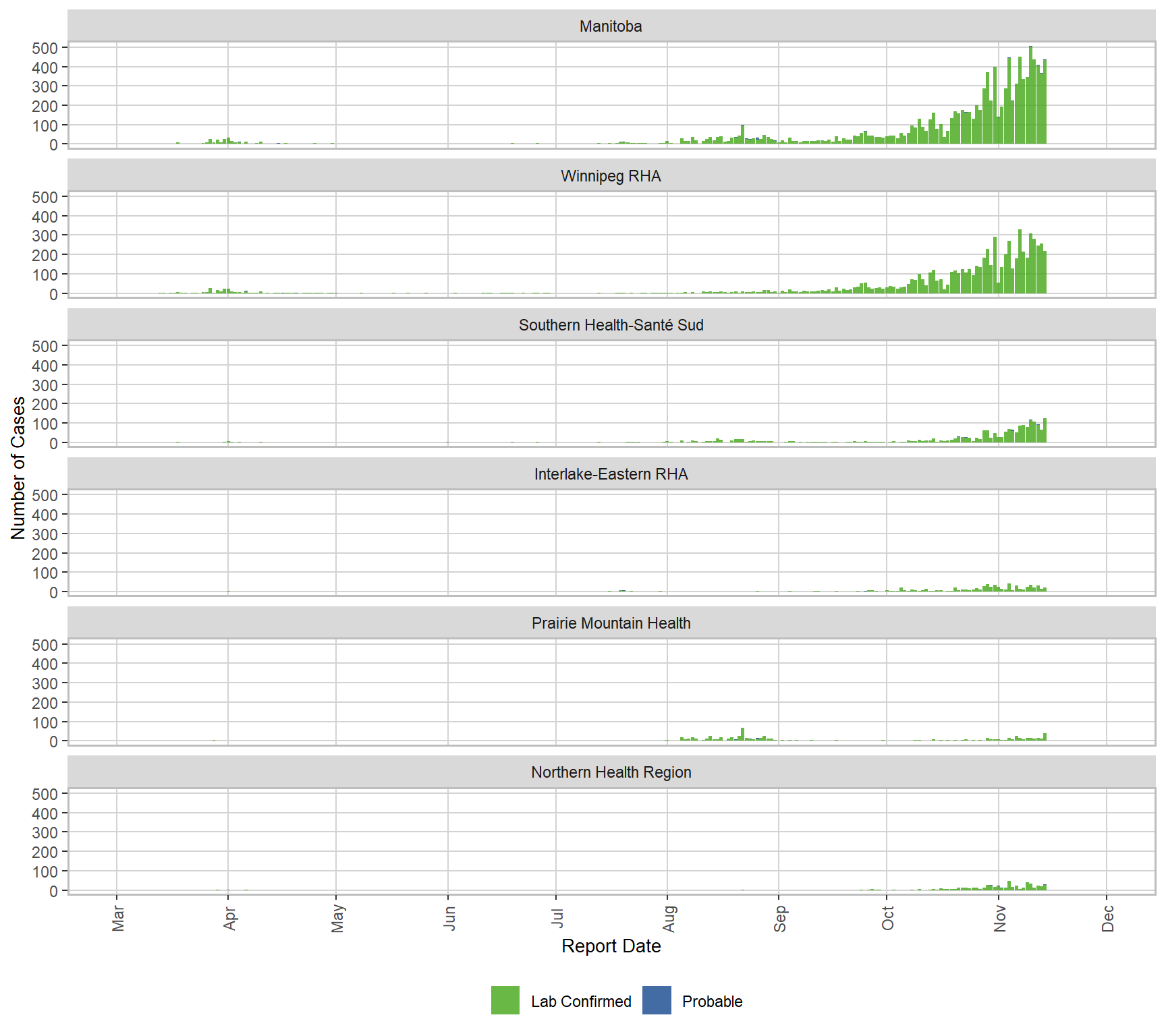 Figure 3. Cases of COVID-19 by Health Region and Public Health Report Date, Manitoba, 2020