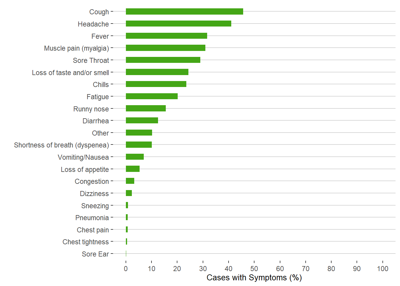 Figure 12. Percentage of Symptoms Reported by COVID-19 Cases, Manitoba, 2020
