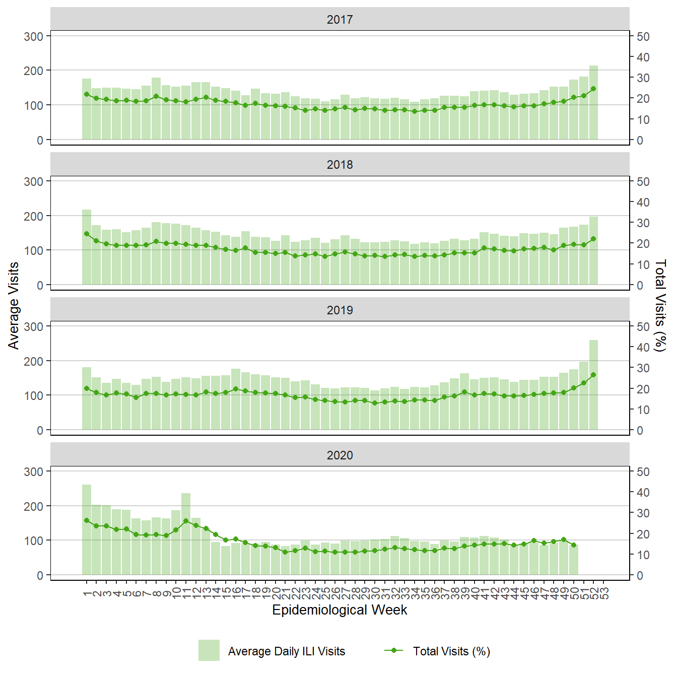 Figure 11. Weekly Percentage of ILI Related Visits to Sentinel Physicians, Manitoba, 2017 – 2020