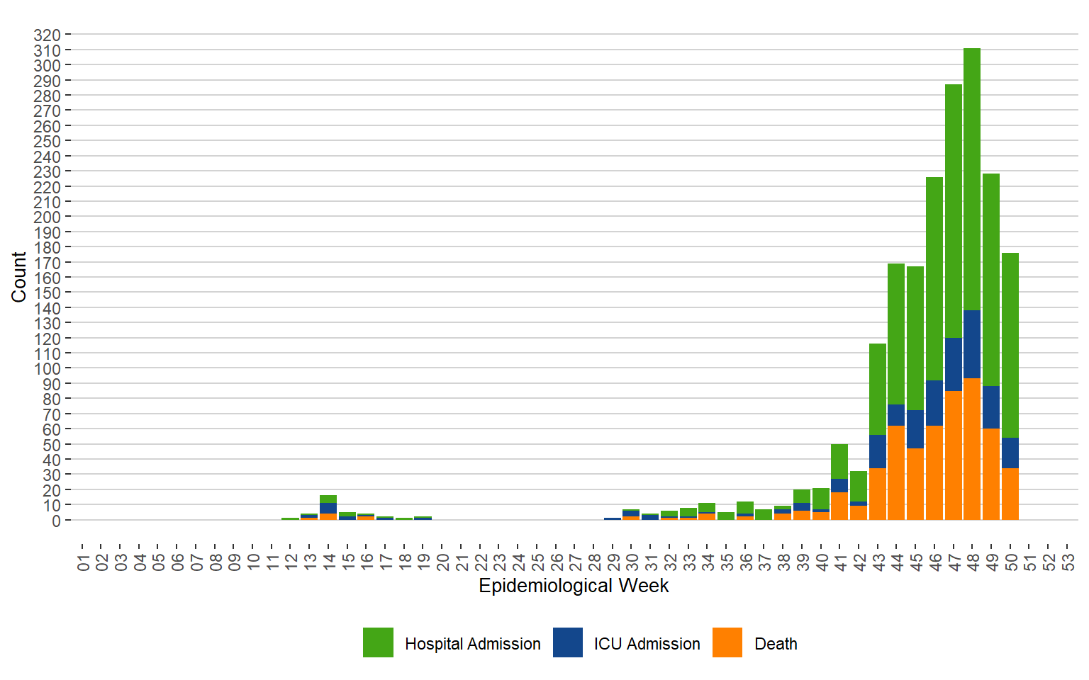 Figure 5. Severe Outcomes of COVID-19 by Week of Public Health Report Date, Manitoba, 2020
