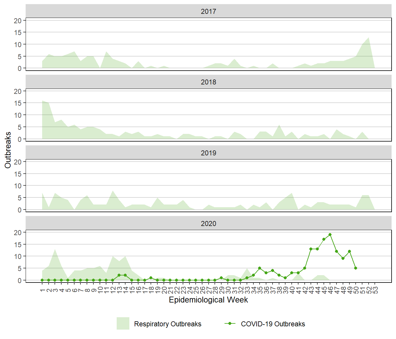 Figure 8. Weekly Respiratory and COVID-19 Outbreaks, Manitoba, 2017 – 2020