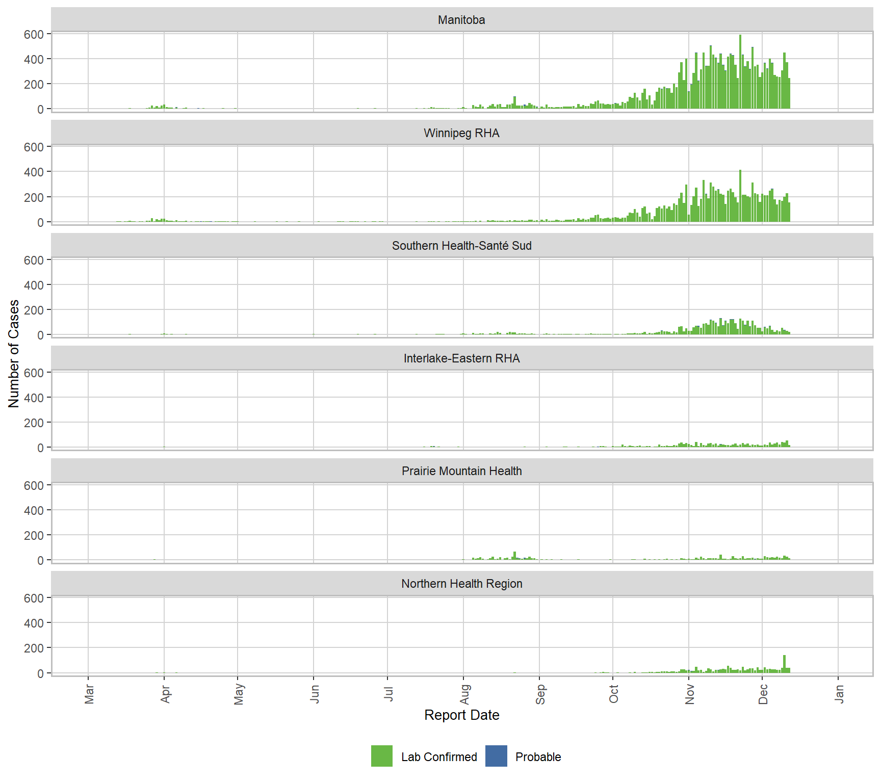 Figure 3. Cases of COVID-19 by Health Region and Public Health Report Date, Manitoba, 2020