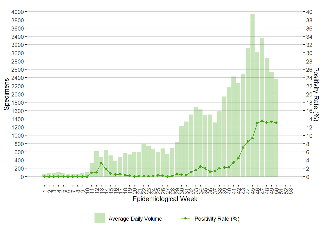 Figure 4. Average Daily Testing Volume and Positivity (%) for COVID-19 by Week of Specimen Receiving Date, Manitoba, 2020